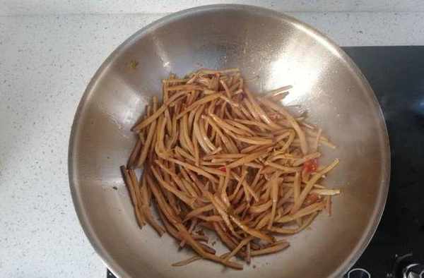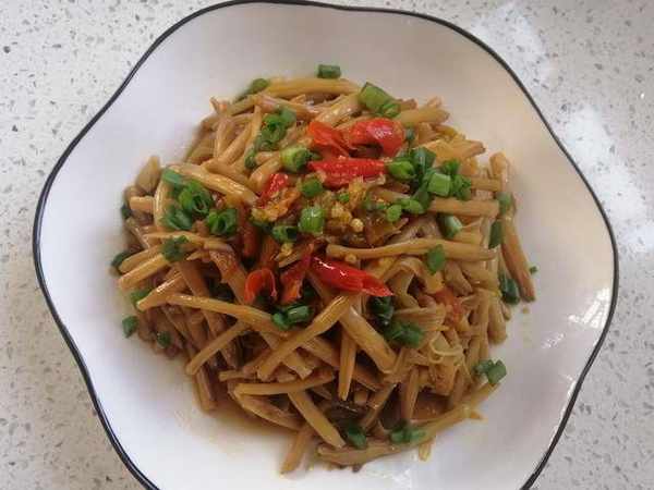 3.調味,熱鍋下冷油轉小火,把辣椒醬放入翻炒飄香,然後倒入鹽醬油薑蒜過油之後,收火放黃花菜攪拌上味。