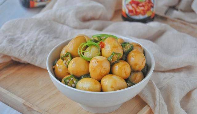 2,鵪鶉蛋煮好後沖冷水,剝殼備用,秋葵切片。