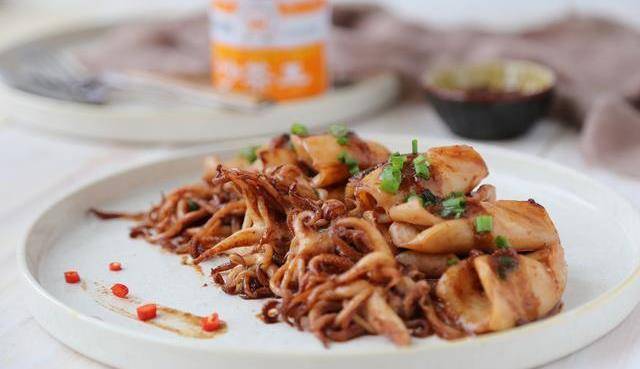 4,倒入魷魚,醬油,辣椒翻炒2分鐘後即可出鍋,撒上蔥花裝飾即可。