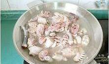 2.鍋內加水燒開,放入雞塊焯燙至血沫浮起。