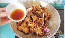 9.放入洋蔥、大蔥、生薑炒香味,趁熱沿鍋邊淋入黃酒。
