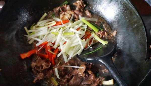 6.爆炒至七成熟後,加入紅辣椒和大蔥絲,翻炒均勻,即可出鍋。