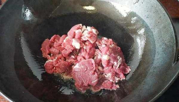 2.鍋裡油熱後,放入山羊肉;