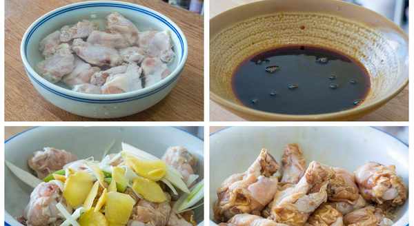 4、小雞腿兒泡好後放入大碗裡面,接著加2勺料酒、1勺生抽、半勺老抽、蔥薑也加進來,直接上手抓拌均勻後醃1個小時 ,期間記得翻動翻動,讓小雞腿兒的每一面都能醃制到;