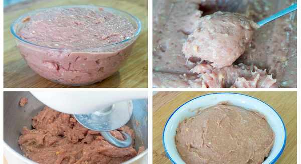 4、接著開始調味兒,薑末、蒜末、鹽、糖、胡椒粉、生抽、土豆淀粉、泡打粉,接著繼續絞打成細膩的肉泥,多攪打一會兒 ,一定要打得特別細膩才行;