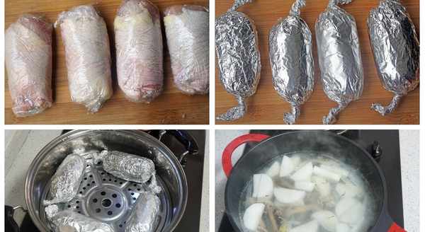 6、卷好後先用保鮮膜包一包,再用錫紙包一包,兩頭給它卷緊,好像一顆大糖果。