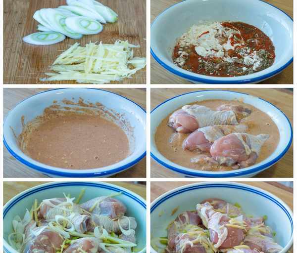5、接著我們來處理醃好的雞腿兒,先把大蔥和生薑都挑出來,不然一起炸的話容易糊,挑好後把雞腿兒都加到我們調好的面糊裡面,然後帶上手套抓拌均勻,讓雞腿的表面都能裹上一層薄薄的面糊;