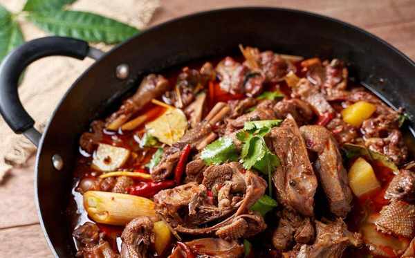 4、然後把鵝肉加進來煸炒,這時候我們把蔥薑蒜、幹辣椒花椒香葉桂皮都加進來一起炒出香味兒,然後再加2勺生抽、半勺老抽、2勺料酒、1勺鹽、1勺胡椒粉繼續煸炒5分鐘;