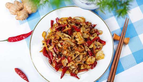 4、再次起鍋,鍋內倒入適量食用油,油熱後倒入蒜末和薑末,煸炒出香味後,再放入幹辣椒段,中小火煸炒;