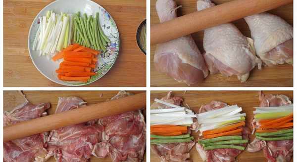 5、現在放上大蔥 ,豇豆 ,胡蘿卜,卷起來,卷的時候手要用點力,這樣才會卷的緊實一些。