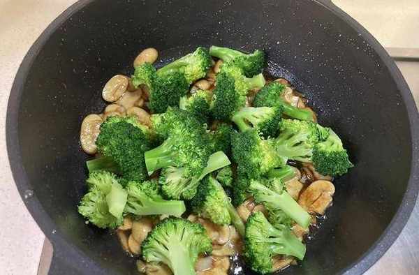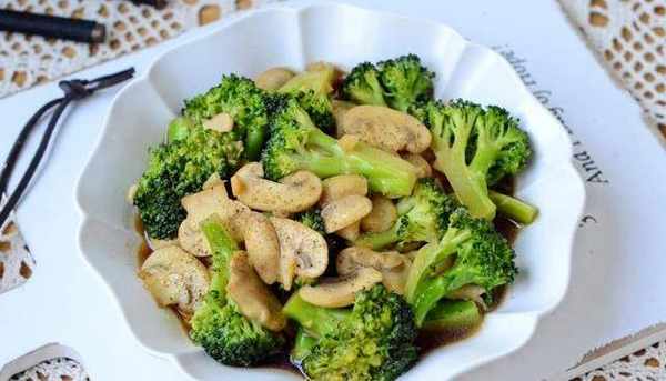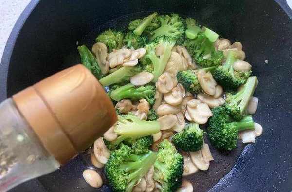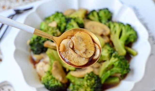 材料:西蘭花250克、蘑菇150克、大蒜頭4瓣、蠔油2勺、生抽1勺、鹽3克、黑胡椒粉少許