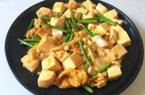 3、熱鍋,大火,倒比平時炒菜稍多的油~油熱倒雞蛋~刺啦~雞蛋隨便巴拉幾下,不用完全凝固時巴拉到鍋裡一邊,下蒜臺段爆炒幾下後和雞蛋一起翻炒,稍軟後把蒸好的豆腐倒入鍋裡