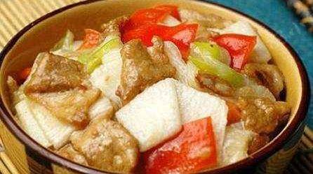 2.熱鍋上油,油熱後下入醃好的肉片滑散後盛出備用。餘油再次燒熱,下大蔥絲煸香,倒入瀝幹水份的山藥片,紅椒片炒勻,調入鹽調味。倒入滑好的肉片,加雞精,白胡椒粉提味後起鍋即可。