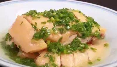 4、取出泡好的三黃雞改刀後裝盤,鍋內燒熱油,沖入蔥花內爆香,淋在雞肉上即可。