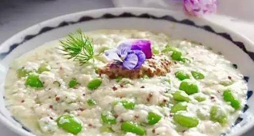 5、過濾瀝幹的豆腐,加上煮熟的毛豆,放上青芥辣以及粗芥末粒,滴上醬油和鹽。拌均勻,放在冰箱冷卻半小時即可食用。