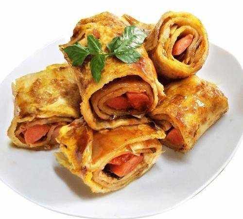 8.根據自己的口味,抹上甜面醬或者蒜蓉辣醬,淋上醋,撒上香菜,放上小香腸