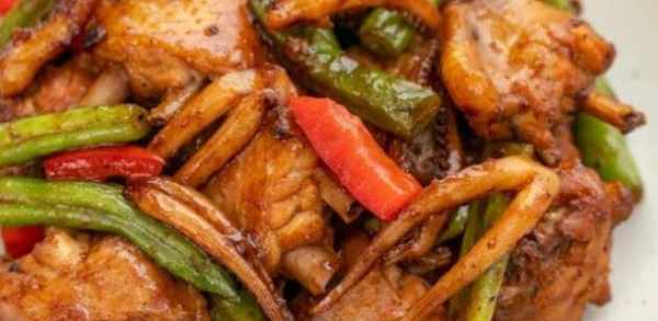 3、鍋留底油,煸香薑米、蔥末,下入炸好的雞腿,噴入辣鮮露炒勻即可裝盤。