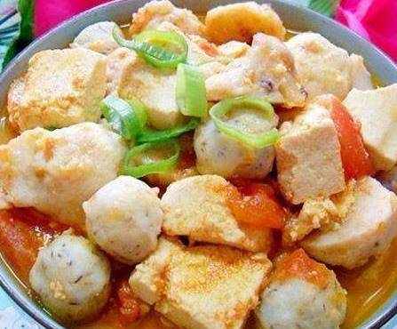 3. 鍋裡放清水燒沸,放入豆腐塊,再燒滾後加入西紅柿、木耳,燒滾後投入魚丸煮熟,放入味精調味;