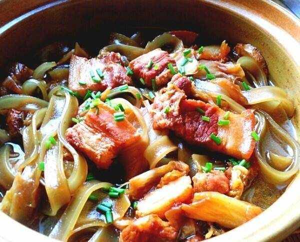 材料: 豬肉400克、紅薯粉條150克、京蔥1根、八角2顆、冰糖8克、薑片3片、生抽2大匙、鹽1/2小匙、老抽1小匙、花雕酒1小匙;