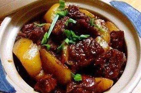 材料:牛腩、土豆、薑片、八角、香葉、花椒、幹辣椒、老抽、料酒、鹽、糖