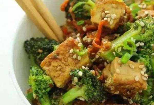 材料:豆腐、芝麻、西蘭花、洋蔥、胡蘿卜,大蒜、紅辣椒、椰子糖汁、鹽、醬油、芝麻油、白胡椒、黑胡椒各適量