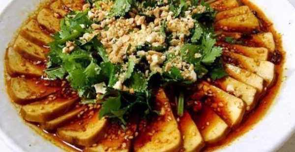 5.把調好的料汁澆在香幹上,放適量辣椒油,撒上花生碎、香菜碎即可。