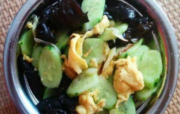 材料:木耳、黃瓜、雞蛋、香蔥、鹽、淀粉、油
