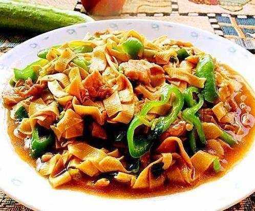 材料:幹豆腐皮300g、紅辣椒1根、蔥花5g、生薑5g、高湯200ml、海鮮醬油2茶匙、鹽2g、水淀粉2湯匙、油3湯匙、青椒