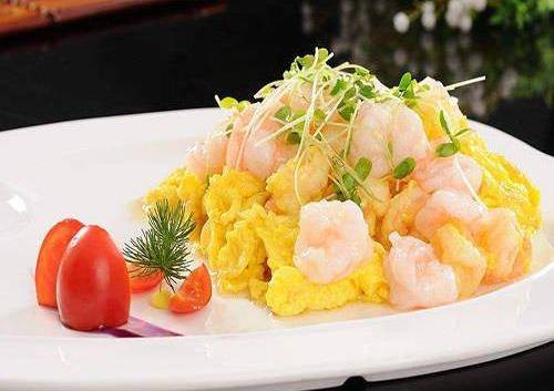 3、炒鍋內放適量油,待油溫八成熱時,倒入雞蛋液,翻炒成塊後倒入蝦仁,加入鹽,炒勻後起鍋裝入盤中。