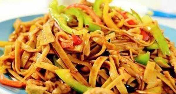 千張小炒肉:1、豬肉切絲,放到小碗裡,用幹淀粉抓勻。千張,青椒,彩椒也都切絲待用。2、油熱到7,8成熱,用蔥和幹辣椒爆鍋。再將豬肉下鍋迅速滑炒,差不多半熟瞭加肉適量的辣豆豉醬和老抽,迅速炒勻後將肉盛到盤子裡。3、用鍋裡剩下的油迅速將千張炒熟,再把肉倒回去,加青椒彩椒絲,加糖,生抽,和少許鹽調味,迅速翻炒均勻就可以出鍋啦