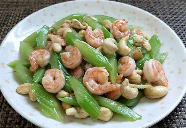 西芹200克、蝦18隻、熟腰果50克、薑4片、蒜2瓣、鹽2克、雞精2克、胡椒粉2克。