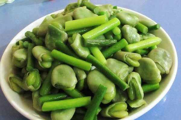 蠶豆1110克、蒜薹135克、鹽適量、白糖適量。