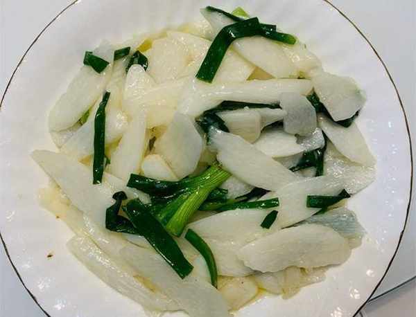 2、加入適量蔥段繼續翻炒2-3分鐘。
