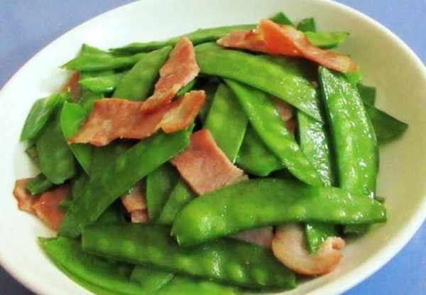 培根80克、荷蘭豆135克、鹽適量、味精適量、油適量。