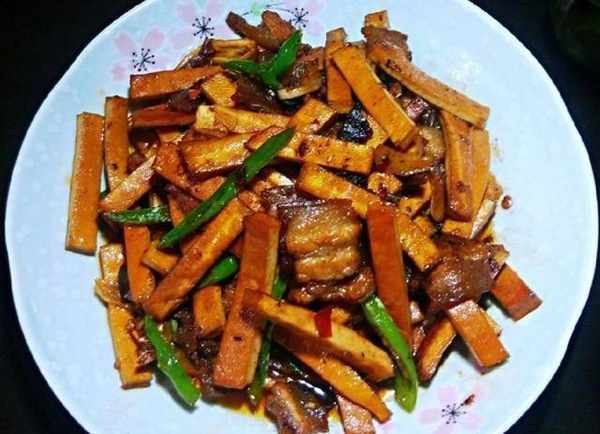 1、五花肉洗幹凈切片,豆腐幹辣椒切條,薑切絲蒜切片。