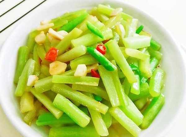 4、另起鍋,爆香蒜末,倒入萵筍爆炒。