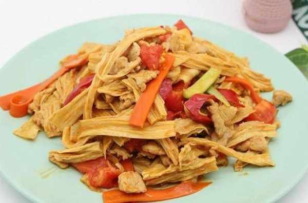 腐竹適量、胡蘿卜適量、紅椒一個、肉絲適量、生薑適量、黃瓜幾片、大蒜適量、玉米淀粉一勺、玉米油10毫升、鹽1克、白糖1克、生抽2毫升。