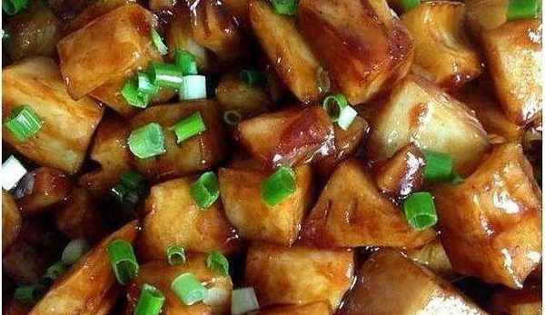 4.油熱後,放入藕丁翻炒,加入糖醋汁;加入水淀粉;出鍋前撒入蔥花;