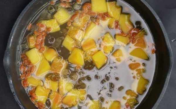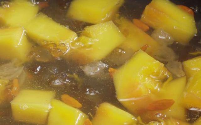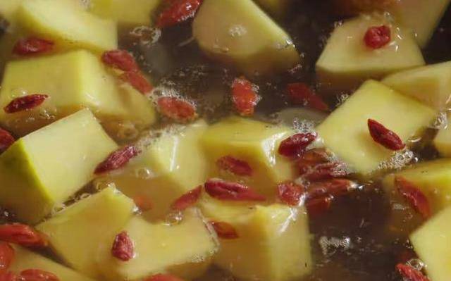第四步:最後把準備好的冰糖和枸杞倒入鍋中,稍微攪拌幾下,把冰糖熬化,然後蓋上蓋,再用小火燜煮十分鐘左右就可以出鍋品嘗瞭。
