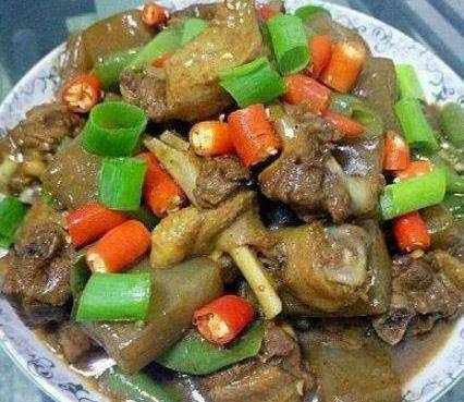 2.蒜隨意切小塊,鍋裡油燒熱,下花椒,八角,幹紅辣椒絲和薑片,出香味之後,立刻下醃好的鴨子翻炒至表皮變色