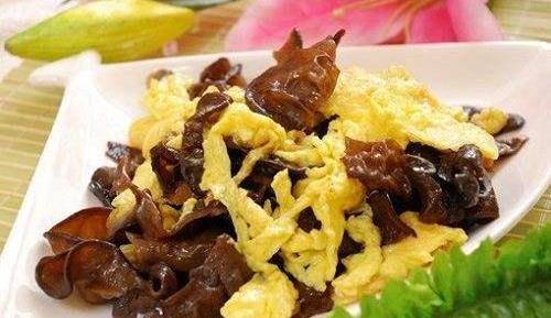 4、待聽到黑木耳發出均勻的噼裡啪啦響聲時,加入雞蛋和鹽,快速翻炒均勻出鍋,裝好盤後撒上香蔥。