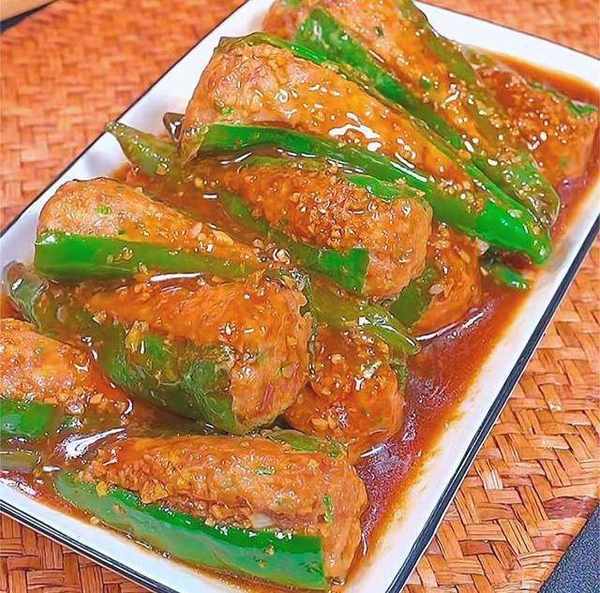 步驟四:鍋中燒油,油熱把青椒肉下鍋,小火煎至表面金黃,再把料汁倒入鍋中,咕嘟八分鐘,大火收汁即可。