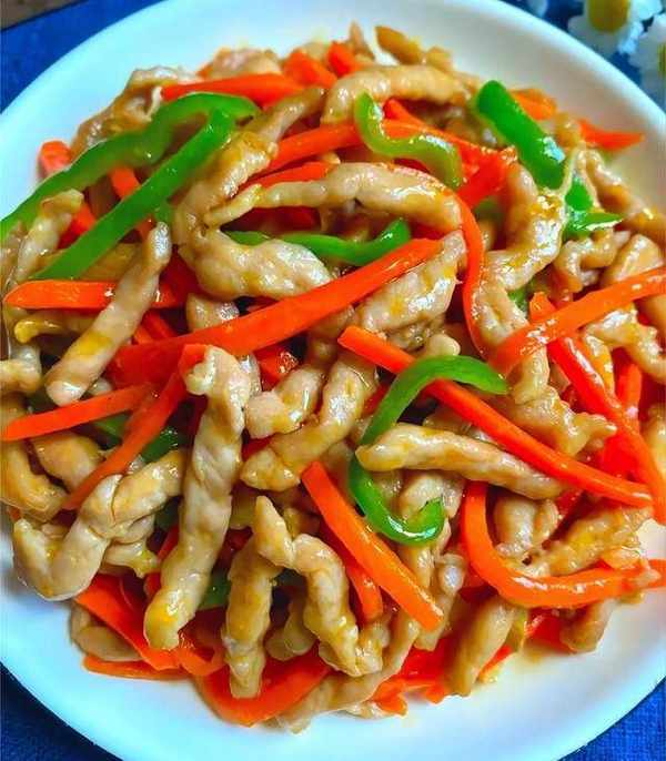 步驟一:胡蘿卜洗凈切絲,青椒切絲,大蒜切蒜片,生薑切絲,裡脊肉切絲,備用。