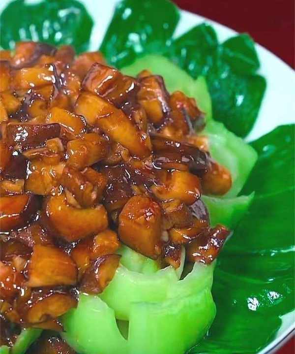 步驟三:鍋中燒油,下入蒜末、香菇丁炒香,再加料酒、蠔油、生抽、老抽、白糖翻炒出香味,最後淋入一點水淀粉,攪拌均勻,倒在青菜上即可。這是一盤團圓菜,祝大傢中秋節月圓人更圓,傢庭幸福美滿。