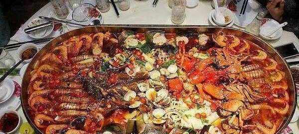 這是一道海鮮大餐,一大盤子的海鮮,盤子就足足有一米多長,裡面鋪滿瞭各種各樣的海鮮,龍蝦、扇貝、蝦、螃蟹……