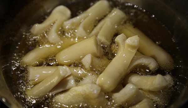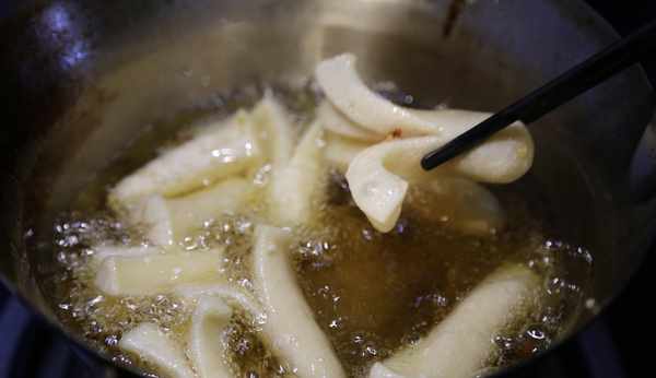 3、 鍋中油熱放入泥腸,待“章魚爪”張開即可,炸制過程中保持中小火