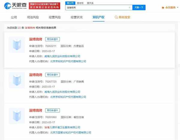 天眼查App顯示,“淄博燒烤”已被多傢公司及個人申請註冊商標,申請人包括威海某農業科技公司、淄博某衛生服務公司、自然人王某某等,國際分類涉及方便食品、廣告銷售、餐飲住宿等,當前商標狀態多為申請中或等待實質審查。
