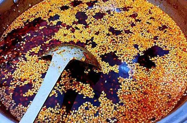 2、起鍋燒熱,然後倒入菜籽油,等油溫五成熱熱後,下入大蒜、生薑、小蔥、紅洋蔥、桂皮等香料慢慢的炸出香味,炸的時候用鍋鏟輕微的攪動,防止糊掉,等所有的香料炸出香味以後撈出以後,將菜籽油升高到六七成熱,然後淋入放入白芝麻的碗中,倒油的時候一定要小心,一點點的倒,防止濺出來,燙傷自己,然後用筷子攪動一下,這時候就可以我們就可以聞見香噴噴的辣椒油瞭。