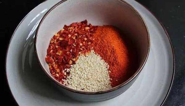細辣椒粉,粗辣椒粉,小蔥,大蒜,桂皮,花椒粒,白芝麻,薑,八角,香葉,鹽,紅洋蔥,菜籽油。