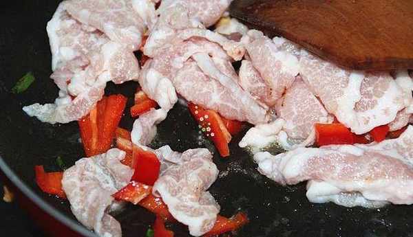 翻炒過的紅椒塊裡倒入切好的豬瘦肉,繼續快速翻炒,把豬瘦肉炒香。